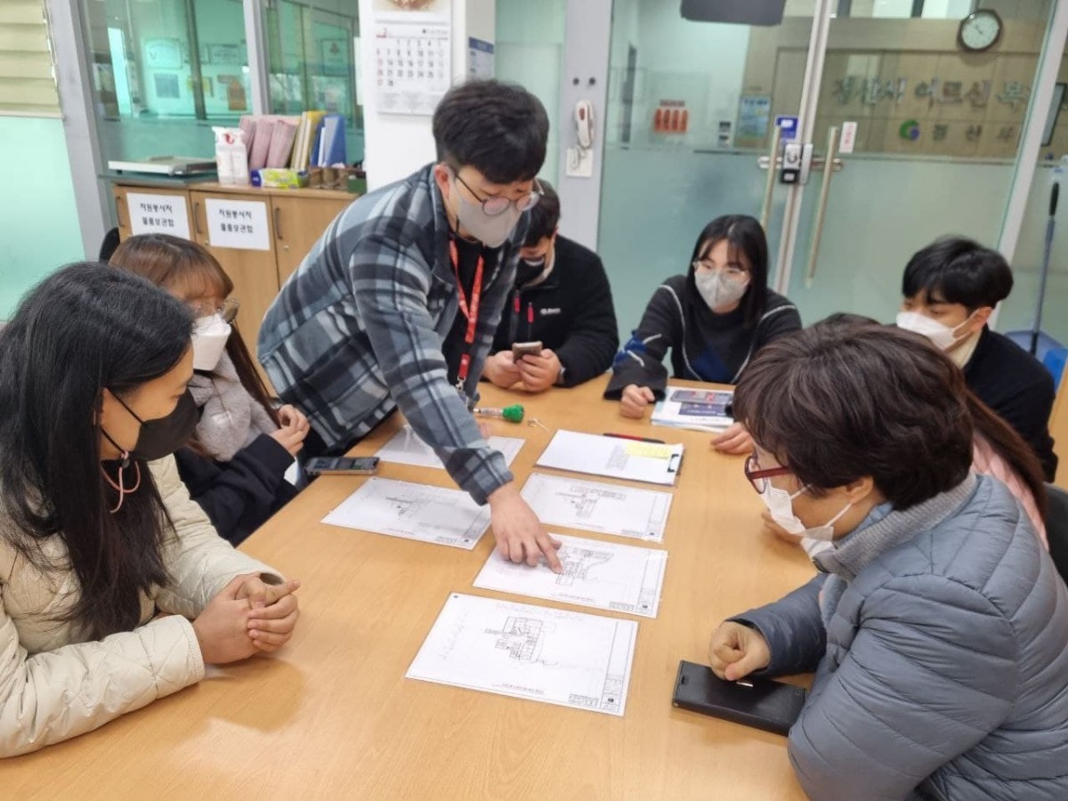 우리 복지관의 소방 시설 배치도를 직원들이 함께 보면서