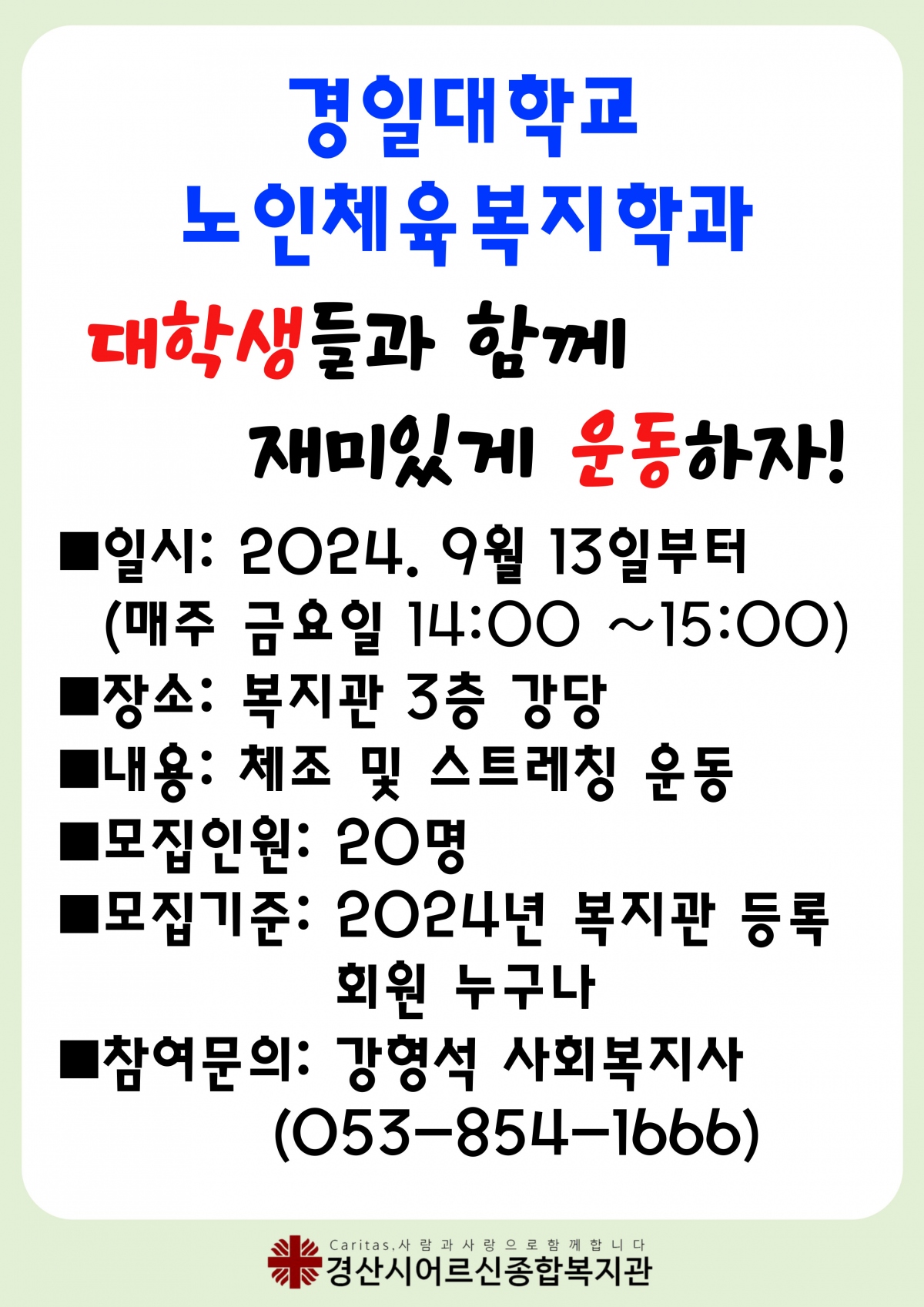 시니어운동프로그램(경일대학교 노인체육복지학과 연계)을 운영하며