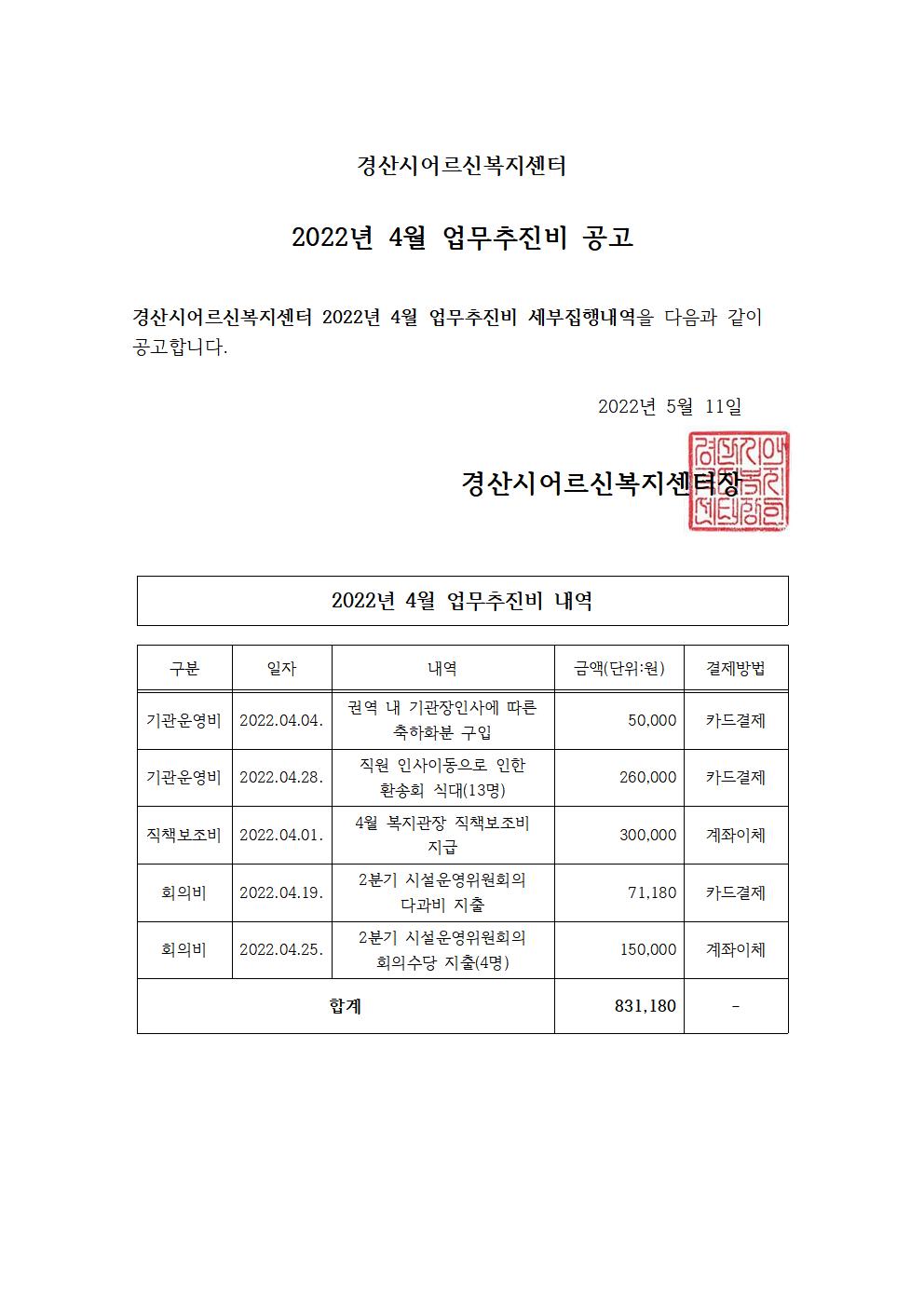 [고시공고]2022년 4월 경산시어르신복지센터 업무추진비 세부내역 공고 페이지 정보 작성자 사무국장신용익 작성일 22-05-11 15:58 조회 1,094회 댓글 0건 본문 페이스북 공유 트위터 공유 구글+ 공유 이전글[고시공고]2022년 경산시어르신복지센터 세입·세출 1차 추가경정예산 공고 다음글2022년 2차 시설운영위원회의 결과 보고 목록 댓글목록 0 댓글목록 등록된 댓글이 없습니다.